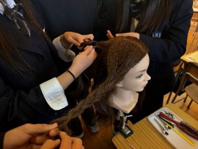 1年次生が、約20の職業について、実習等を通して体験しました。講師は、近隣の専門学校の先生方にお願いしました。写真は、美容師の仕事を体験している様子。「難しいけれど、やりがいを感じました」と感想がありました。