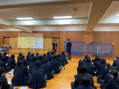 体育館では、バレーボール部、バスケットボール部、バドミントン部の通常練習が行われており、中学生は、部員に交じって部活動体験をしました。高校の部活動は、質的にも、量的にも、レベルアップしていきます。みなさんが、コートに立つ日が楽しみです。