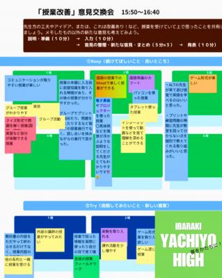 【授業改善プロジェクト】授業改善推進チームにより、生徒との「授業改善意見交換会」を行いました。各系列の3年次生が20名弱ほど集まり、「Canva」の「ホワイトボード」を使って、keep(続けてほしいいこと・良いところ)problem(改善してほしいこと・課題点)try(挑戦してみたいこと・新しい提案)の3つの観点で意見をまとめました。生徒からは「一方的な講義」よりも「対話や体験を通じた双方向の学び」を求める声が多く挙がりました。この内容を授業改善推進チームにフィードバックし、今後の授業改善に活かしていきます。→「授業改善テーマ」は「共に『学ぶ場』へ」となりました。今後の授業づくりに活かしていきます!