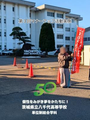 【マナーアップ活動】11月14日(金)に第3回のマナーアップ活動を行いました。今回は、PTA、町役場、下妻警察署の皆さんのご協力をいただきました。ありがとうございました。引き続き、生徒の「マナーアップ」と「交通安全」に努めていきたいと思います。