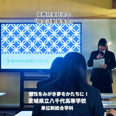 【家庭系列】12月8日(月)潮来高校で行われた「高教研家庭部会探究活動発表会」に代表の3年次生2名が参加してきました。本校の探究活動の主題は「生活の中のお茶について」です。地元の特産「さしま茶」をテーマにして、さまざまなお茶の飲み方を体験し、どうしたらもっと日常的に取り入れることができるかを考えてみました。でも、調べていくと実は、お茶は太古の昔から取り入れられ、生活の中で、たくさんの用途があることがわかりました。抗菌殺菌作用ははじめ、様々な効果があり、研究されています。お茶はすごい!と実感することができました。