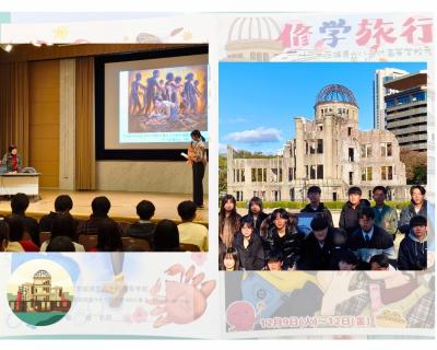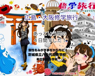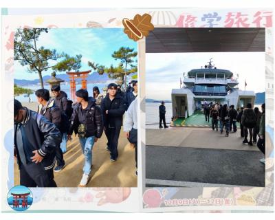 【2年次修学旅行】12月9~12日まで、広島・大阪方面に修学旅行に行ってきました。天候に恵まれ、すばらし4日間でした。広島の平和記念資料館での平和学習では、被爆体験者の方のお話に聞き入りました。また、世界遺産である原爆ドーム、宮島厳島神社、姫路城は見応え十分でした。そしてユニバーサルスタジオジャパンでの体験も忘れられない思い出となりました。今後も充実した学校生活になるようにしたいと思います。関係者の皆さん、お世話になりました。